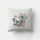 Een kussen met een trio van vlinders die wapperen tussen enkele bloemen. Blauw roze en groen kleurenschema.