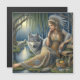 Onder de rustige gloed van het maanlicht, rust een serene vrouw bij een bosstroom, haar elegante houding straalt contemplatie uit. Ze is versierd met een hoofdtooi en een fijnmazige uiterlijk die de wouden een ingewikkeld patroon geven, en deelt een stille communie met een majestueuze grijze wolf. Op de achtergrond versmelten de schaduwen van wolven zich met de bomen, waardoor een harmonieuze samensmelting van wilde geest en vredige omwenteling ontstaat.