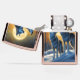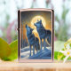 Twee wolven huilen samen bij volle maan, beschilderd tegen een schemerhemel geschilderd met warme zonsondergangtinten, waardoor een boeiende en serene sfeer wordt gecreëerd.