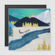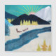Een digitaal landschap met heldere kleuren en texturen die een musser tonen met een team van hondenroosters en een gloeiende roze zonsopgang in tinten blauw, goud, cyaan en geel.
