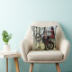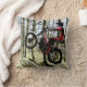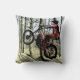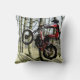 Een vierkant goot kussen of kussen met een digitaal poster-effect-kunst van een testmachine met motorfietsen in de middelste lucht, die over een rots op een moderne machine springt. Het ontwerp is rood wit en zwart, met een achtergrond van bleke groene rotsen en bomen en bleke blauwe hemel. Made van een foto ©ruralfrankrijk