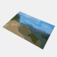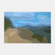 Een helder, kleurrijk abstract ontwerp van een uitzicht uit de bergen, met blauwe lucht, rots en bomen.