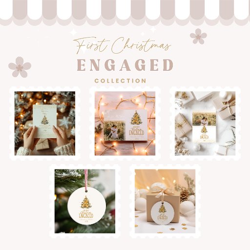 Célébrez votre fiançailles avec cette carte élégante et festive avec un arbre de Noël fleuri doré et un espace pour votre photo préférée. Une façon chaleureuse et joyeuse de marquer votre première saison de vacances ensemble.