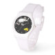 Grappige cartoon witte muis met roze poten en oren, springend in de lucht over een oranje wigg kaas. Zwarte achtergrond met witte stippen. Veel plezier in het voorbijgaan van de tijd met dit zeer schattige polshorloge!