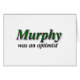 "Murphy was een optimist" Een humoristische kijk op de beroemde pessimistische Murphy's wet. Het professionele ontwerp ziet er goed uit en misleidt de lezer tot ze zien dat de lijn van het label het nog grappiger maakt.
