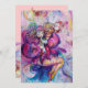 Kleurrijke, griekse, grappige, roze clown die een balletje speelt met een expressieve uil en vrolijke muzikale noten, bloemen, bladeren in levendig rood, fuchsia, violet, paars, blauw, witte kleuren, schilderij van waterverf door Bulgan Lumini (c)