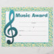 Muziekprijscertificaat voor muziekdocenten en banddirecteuren. Maak uw student trots op hun prestaties met een aantrekkelijk certificaat! De tekst "Music Award" kan worden gewijzigd. De vier lijnen verklaren "voorgesteld aan", "voor", "op deze dag"blanco "van"blanco, en "ondertekend".