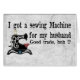 "Ik heb een naaimachine voor mijn man - Goede handel, hè?" Een afbeelding van een naaimachine met een gekke grap voor riolen. Het perfecte cadeau van de hulpverlener!