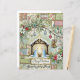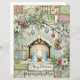 This design features a beautiful patchwork background of vintage floral, plaid, and damask patterns in soft pastel shades of pink, blue, and green. The centerpiece is a heartwarming traditional Nativity scene with Mary and Joseph kneeling by the baby Jesus in a snow-covered stable, crowned by the Star of Bethlehem.