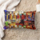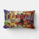 Dit kleurrijke abstracte kunstwerpkussen toont rijen drankflessen die licht reflecteren op een baroppervlak. Maakt een mooi accentkussen voor den, bar of slaapzaal.