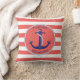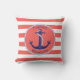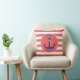 Dit nautische themakussen heeft een anker in het midden op een koraalachtergrond met een cirkelvormige touwrand. Het woord "Captain" is boven en onder een naam om te personaliseren. Achtergrond is koraal en witte strepen.