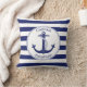 Dit nautische themakussen heeft een anker in het midden met een cirkelvormige touwrand. Het woord "Captain" is boven en onder een naam om te personaliseren. Achtergrond is marineblauw met witte strepen.
