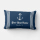 Nautical lumbar werpen kussen in een horizontaal formaat met een elegant bootanker met preppy horizontale strepen. Pas de aangepaste tekst aan met de naam en locatie van uw boot. Het ontwerp omvat een klassiek blauw- en witkleurenschema voor de kustmarine.