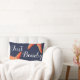 Trendy hand lettered scriptwoord "Just Beachy" in witte en rode oranje zeester over een donkerblauwe achtergrond. De achterkant van de kussen heeft een hoop rode oranje zeester.