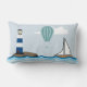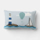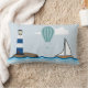 Digitale nautische scène met een zeilboot die in een golvende oceaan vaart en een hete luchtballon die drijft, passeerde een gestreepte vuurtoren. Sierkussens.