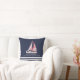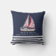 Moderne gepersonaliseerde nautische kussen voor een meerhuis, boothuis of strandhuis met een zeilbootillustratie, strepen en sjabloon tekst aan te passen met uw familienaam, jaar vastgesteld of andere tekst. De boot is voorzien van rode zeilen op dit ontwerp.