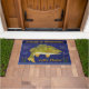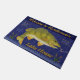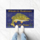 Deze coole, gepersonaliseerde doormat is perfect voor je meer huis. Het show een originele tekening van een baars vis die op het punt staat een haak te bijten. In de tekst staat: "Welkom bij [Jouw naam] Lake House." Het ontwerp is gemaakt in tinten blauw, groen, geel en bruin en omvat een golfgrens langs de bodem met staarten.