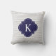 Eenvoudig, elegant, modern en trendy horizontaal lichtgrijs of grijs en witte strepen patroon of ontwerp met een accent Navy Blue-kleur Quatrefoil of Marokkaans monogram voor Kussens met vierkante schroefdraad en lumbale afmetingen of roestbakjes. Het Monogram van de douane met uw Initiaal of naam in een preppy doopvont. Dit klassieke hedendaagse nautische ontwerp zal elk huisdecor, strandhuis, woonkamer, lounge, bank, sofa, slaapkamer, kantoor, boot, kleuter, universiteits- of universiteitskamer, tieners, meisjes, jongens, baby en kinder of kinderkamers verbeteren. Kies uw grootte van kussen of kussen. Perfect voor Kerstmis, Gejaarden, Wedding, Verloving, universiteitsgeschenken. Klik op de knop 'Aanpassen' om je cadeau aan te passen door je eigen initialen toe te voegen. Kies uw eigen doopvont en kleuren om het uw te maken. Ga voor meer kleuren naar zazzle.com/d_zone_designs