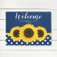 Land met de naam welkome boomklep, met gele zonnebloemen op een blauw marineklein. Eenvoudig aan te passen met je familienaam en het jaar.