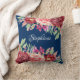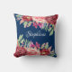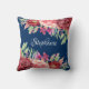 Dit kussen heeft een modern waterverf ontwerp met bordeauxrode, perzik en rode bloemetjes met bladeren en bladeren op een marineblauwe achtergrond. Personaliseer het met een naam.