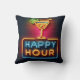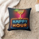 De heldere neonlichten tonen het bericht "Gelukkig Uur"en cocktailgrafiek op een bakstenen muurachtergrond