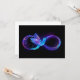 Paarse oneindigheid met een gloeiend symbool, met een lichte, blauwe kolibrie op zwarte achtergrond. Neon.