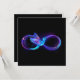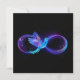 Gloeiend, paars oneindigheidssymbool met vliegende, lichtgevende, blauwe kolibrie op zwarte achtergrond. Neon.