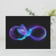 Gloeiend, paars oneindigheidssymbool met vliegende, lichtgevende, blauwe kolibrie op zwarte achtergrond. Neon.