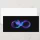 Gloeiend, paars oneindigheidssymbool met vliegende, lichtgevende, blauwe kolibrie op zwarte achtergrond. Neon.