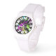 Opvallen in de menigte met deze coole neonverf spat kleurrijk groen, roze, geel en paarse regenboog van kleur op zwarte achtergrond, polshorloge, gepersonaliseerd met naam of tekst, in heldere, fluorescerende tinten. Maak een leuke en frisse stijlstatement met deze retro jaren 80 mode.