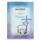 Le mouton est devant une croix bleue sur cette carte de félicitations catholiques alors que vous célébrez la première confession d’un garçon.