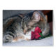 Chat tabby de race mixte dormant dans le profil, avec son visage penché contre une rose rouge. Intérieur vierge.