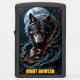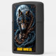 This dark, illustrated lighter features a fierce-looking wolf's head and chest with piercing yellow eyes. A large, detailed full moon sits directly behind the animal's head. The wolf and moon are surrounded by intertwined, dead branches and dark, swirling, wave-like shapes. The phrase "NIGHT HOWLER" is set in stylized yellow block letters at the bottom. The design is set on a matte black lighter casing. The design may look real due to the high detail and three-dimensional texture in the artwork.
