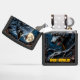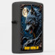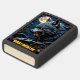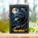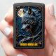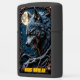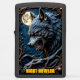 This dark, illustrated lighter features a fierce wolf with an open mouth, pointed fangs, and a visible tongue. The wolf's body is surrounded by gnarled, dark, skeletal branches and swirling blue smoke or mist. A bright, textured full moon is visible in the dark blue night sky behind the animal. The phrase "NIGHT HOWLER" is set in stylized yellow block letters at the bottom. The design is set on a matte black lighter casing. The design may look real due to the high detail and three-dimensional texture in the artwork.