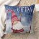 Stap in de vakantiestemming met dit schattige waterverf kabouterkussen met een rode en witte Scandinavische kabouter die probeert te balanceren op zijn ski's. Er is een witte tekst die Ufda zegt." De achterkant heeft een rood en wit kermispatroon.