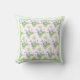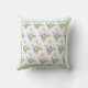 Een mooi werpkussens met een patroon van roze rozen, roze witte Mock Oranje Blossom en paarse lavendel met een groene en witte rand, van een handbeschilderd waterverf ontwerp van Judy Adamson.