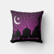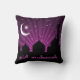 Illustration islamique avec des silhouettes de la lune, des étoiles et d'une mosquée sur un ciel nocturne pourpre.