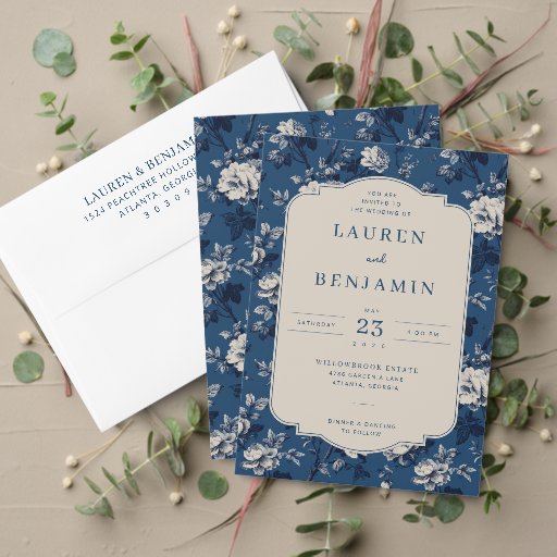 Celebrate your union in style with our “Flourish & Fête” suite—an exquisite blend of timeless rose florals and refined design, crafted to set a graceful tone for your wedding day. This collection features vintage style artworks that evoke timeless sophistication and romance. The dominant colors are rich navy blue, soft beige, and elegant white, accented with floral patterns in a classic chintz design. Each piece exudes an air of refined grace, from wedding invitations to thank you cards and menus, all unified by the recurring motifs of intertwined flowers and initials. The cohesive aesthetic is versatile across multiple product types such as announcements, programs, table numbers, and gift tags, ensuring a harmonious look for every aspect of the special day.