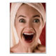 Une femme porte une serviette autour de sa tête après une douche et ouvre sa bouche au loin dans l'excitation. Qui s'inquiète ce que l'occasion est ! Cette carte adapte n'importe quelle occasion heureuse !