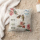 Deux magnifiques oiseaux vintages perchés sur des branches aux roses roses roses, et une petite touche de montre vintage de poche, de belles libellules vintages et des papillons bleus sont posés sur un arrière - plan crème avec de jolies écritures avec des touches de bleu d'une carte postale italienne vintage pour faire de cette belle nature thème pillow floral.