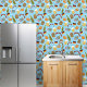 Oktoberfest thema behang voor uw keuken of nieuwigheid restaurant ruimte. Beschikt over Duitse vlag, bier, pretzels en braadworst op een blauwe polka dot achtergrond.
