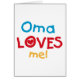 Oma Loves Me T-shirts, cartes, autocollants, sacs de carrosserie, et plus avec coloré rouge, jaune, et bleu texte et conception du coeur. Ces vêtements et cadeaux Oma Love me feront sourire Oma!