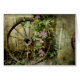 Oude wagonwiel met een "clematis"-foto met een antiek "grunge overlay"-wenskaart om te herinneren aan tijden die voorbij zijn gegaan.