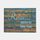Blauw, bruin en geel groen gekleurd houten plankpatroon met "Relax.. je bent op de meertijd", citaat. Decoratief, schattig en modern thuisdeuropbrengst voor het versieren van de ingang van je huis, de veranda van je strandhuis, het landhuis, de logcabine, het meer of het riviervakantiehuis.