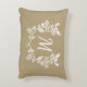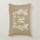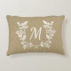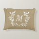 Accessoire kussen met witte florale kreet en aangepast monogram op een beige achtergrond met nood.