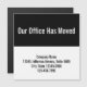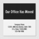 "Onze Kantoor heeft zich verplaatst" is in grote, witte tekst bovenaan. Vier lijnen van zwarte vertoningstekst zijn bij de bodem. U kunt de tekst uitgeven om uw bedrijfnaam, adres, en telefoonaantal te shows.