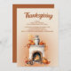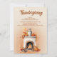 Thanksgiving dineruitnodiging met oranje pompoenen die een gezellige, warme open haard versieren