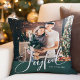 Dit elegante kerstvakantie kussen zegt "Vreugdevol" in moderne witte script kalligrafie. Voeg je favoriete familiefoto en jouw naam toe. Het onderste deel van het ontwerp, en de achterkant van het kussen, is een feestelijke groene kleur.