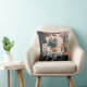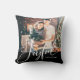 Dit elegante kerstvakantie kussen zegt "Vreugdevol" in moderne witte script kalligrafie. Voeg je favoriete familiefoto en jouw naam toe. Het onderste deel van het ontwerp en de achterkant van het kussen zijn donkerzwart.