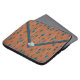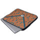 Het ontwerp van deze neopreenlaptophoes is een stijlvolle, veelzijdige stijlaanduiding en is opgesteld in de stijl van een balletkoppeltas. Het is een patroon dat eruit ziet als gepantserd weefsel in een verbrande oranje kleur, met bolletjes die door het weefsel ontstaan in schaduwen van geel sinaasappel en waterblauw. De vormen worden gesmolten alsof ze vallen. De bovenste flap van de paars wordt gestreept door een band getextureerde blauwe plekken, met een zeer dunne rode oranje rand. Op de handtas is er een blauwe zilverdiamantvormige sluiting aan de top van de flap. Op dit is een monogram dat voor u wordt geplaatst om te personaliseren, of schrapt als u verkiest.
